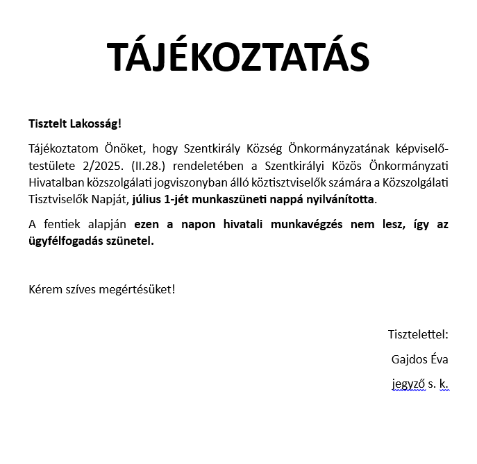 Tájékoztatás Július 1-jei ügyfélfogadási szünetről